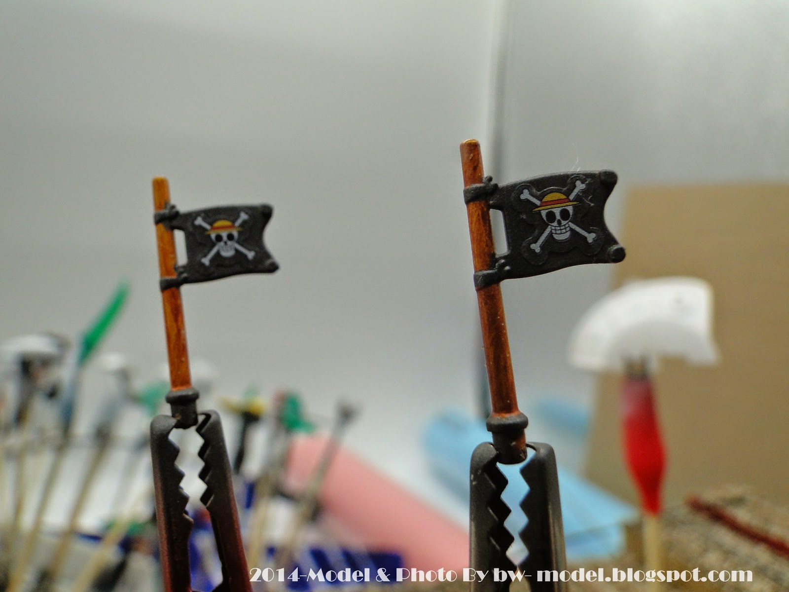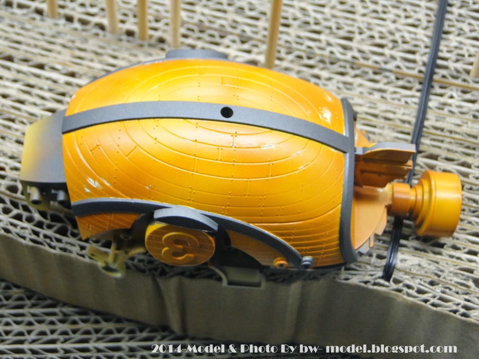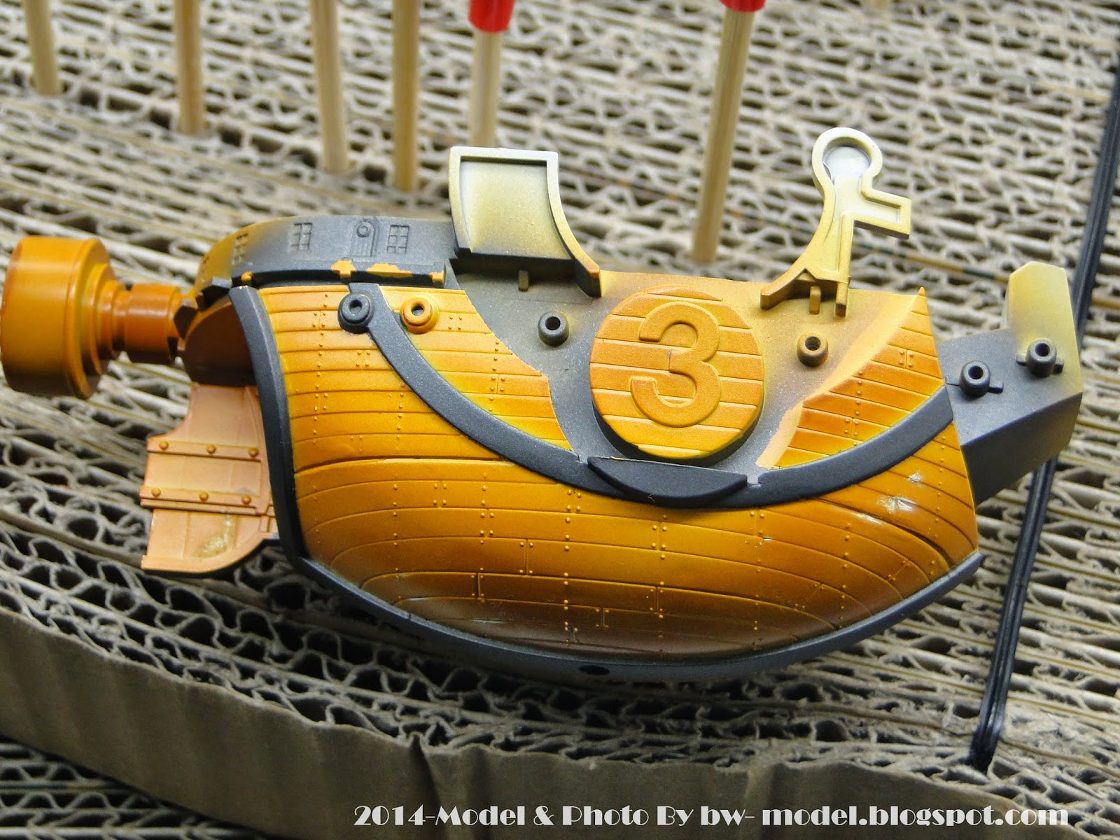 將船首及兩側連同船上半部一起組裝~完成後再將船身的無縫補上~打磨~補色~最後再以深咖啡色乾掃帶出船身木紋及航行過後的全船身微微舊化~ (被罵黑黑髒髒..只好只用微微的就好) |