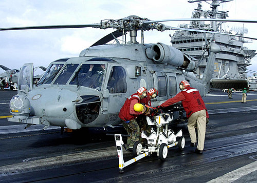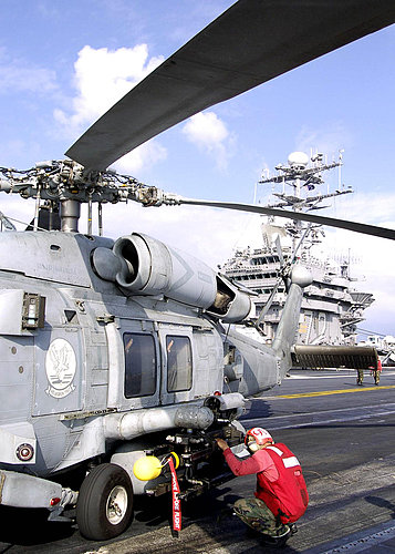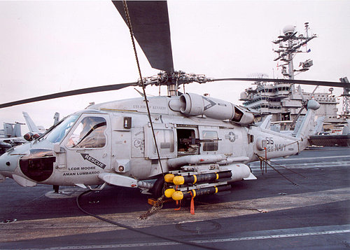 美國海軍 SH-60B Seahawk海鷹直昇機正進行AGM-114B Hellfire地獄火飛彈裝彈作業中,位於CVN 72航空母艦.