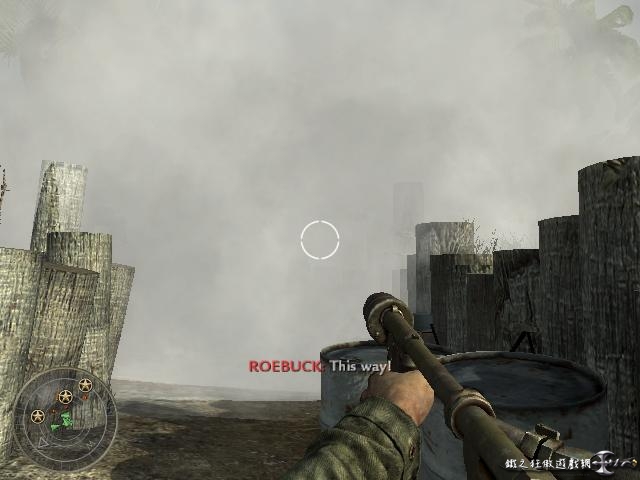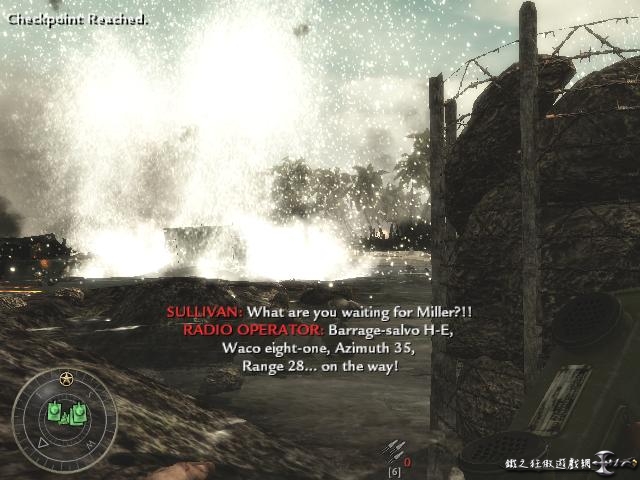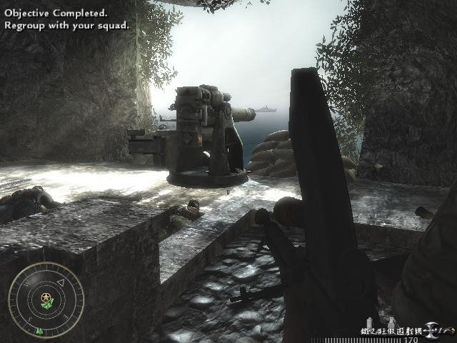 又是登陸戰(= =||)。登陸艇就要到達海岸時擱淺了,然後被炮彈擊中,主角和隊友全部落水,危急時刻時,羅巴克將你拉出水面,並讓你呼叫火力支援炸掉敵人的海岸防線,按6出現光圈,將光圈移動到敵人的防線上,點射擊鍵鎖定(這時候水花超大,看見光圈變綠就按下去,然後躲一旁)清掉之後往前方走。