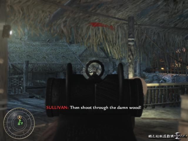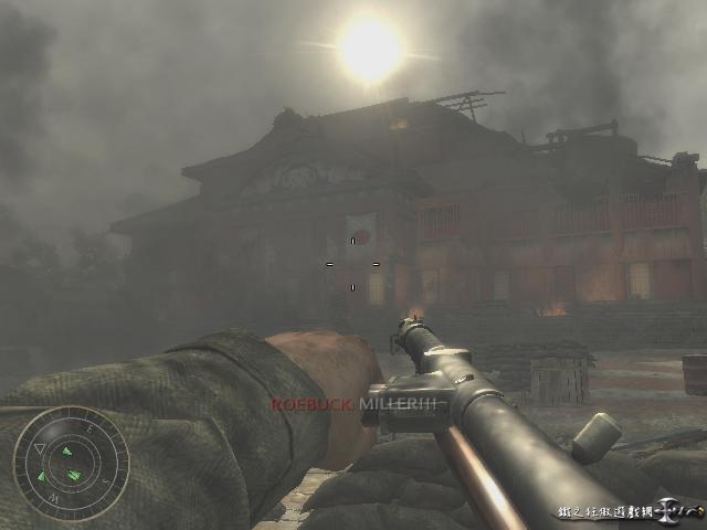 4個陣地都搞定後,又是一段屋內戰,出了屋子會先看見3個想投降的日本兵,結果他們是詐降。自爆之後會有大批日軍殺出,(中間又有機槍可以拿)這時候你可以呼叫空襲炸房子。先炸沒旗子的,