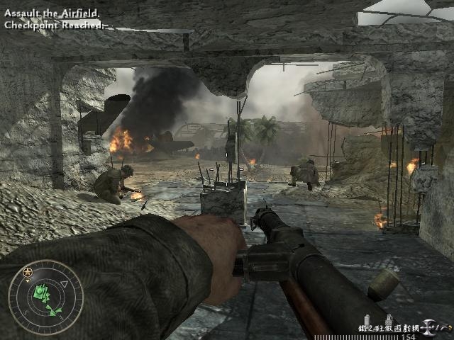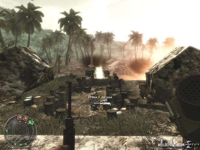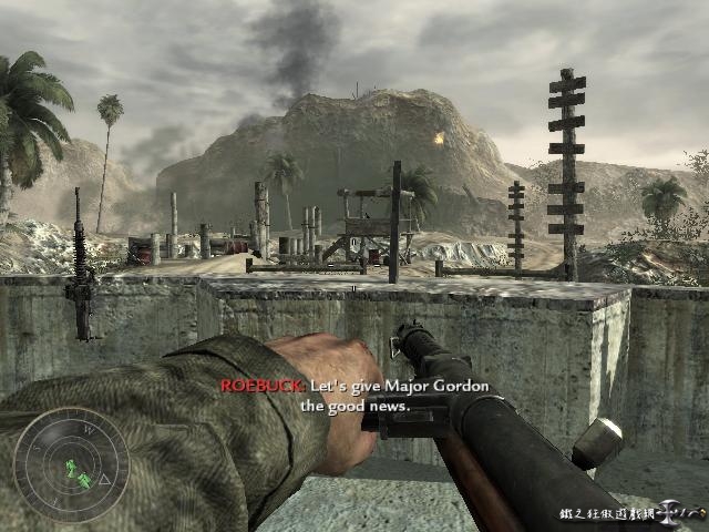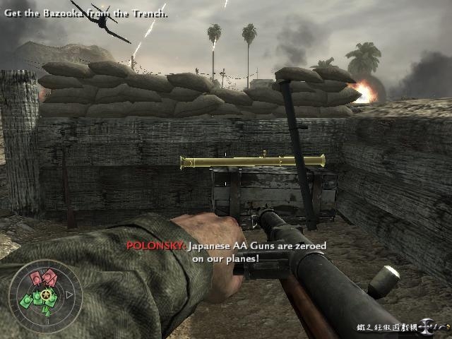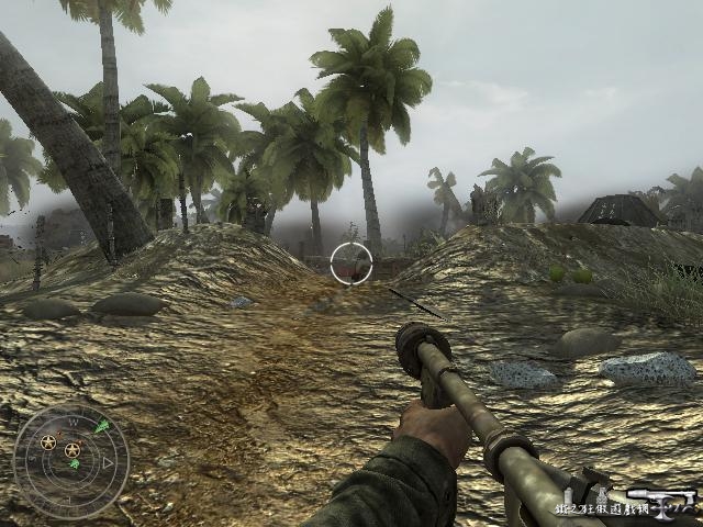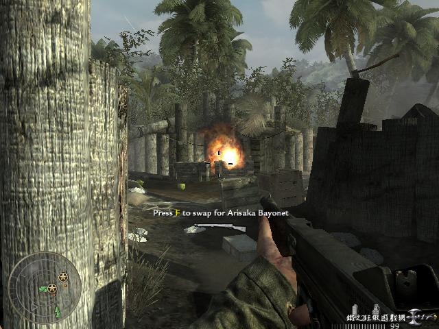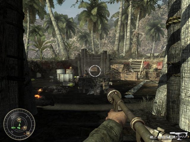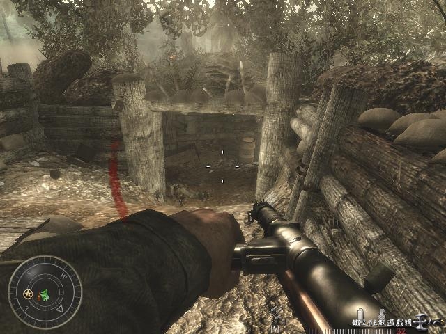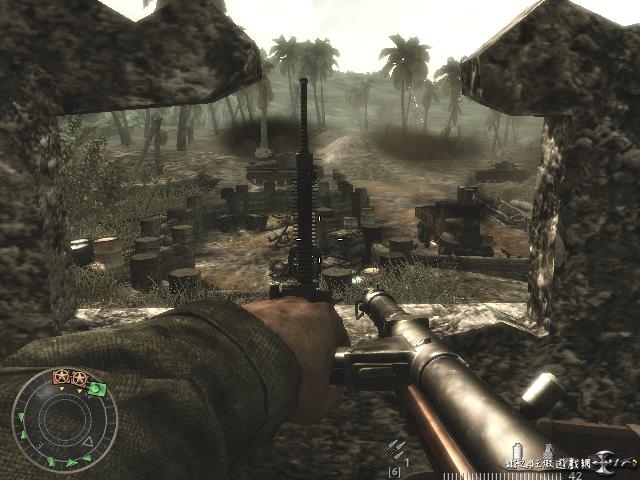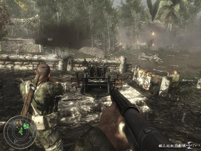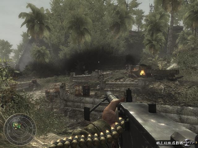 先是一道防線清光後是往左邊移動,又冒出幾隻小強,噢不!!是日軍,一路沿著防線走,會看有棵椰子樹,有個日軍會往上爬。一開槍地板上躲著的日軍也都會爬起來。清光往前走會碰到左方有個兩層樓的機槍碉堡,可以先躲卡車那邊