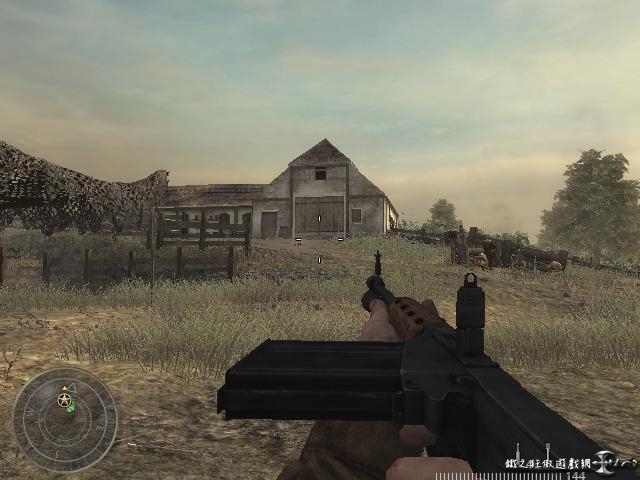 穿過先是經過一段平地,有一堆長長的草跟幾棵耶子樹,想也知道是有什麼東西了吧。清光後往前走,發現友軍們被一棟建築內的敵人用火力壓制住了,低頭去對面的卡車後面拿加裝了榴彈發射器的M1