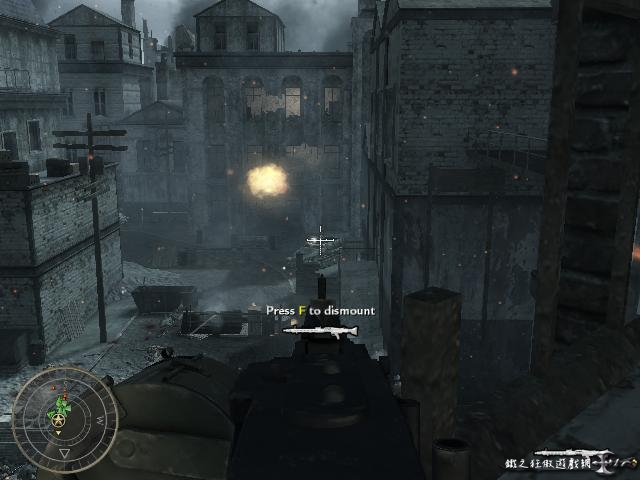 然後往前方走,到了一個很像浴室的地方會先來一場大混戰一路清光屋內的敵軍之後下樓,會看見右邊有投降的士兵被我方的人射殺的畫面,到一道牆面前停下,會有輛T34把牆撞開,衝出去後先是清光前方的德軍(這邊好像是無限再生的,請儘量往前衝)然後會換成左邊的建築物那邊有德軍冒出來攻擊。一樣下方的清完後進入掃蕩,然後出建築物到大街跟我方坦克會合。要出大街時左手邊的地下鐵入口那邊的德軍是無限再生的,請快速越過那邊。