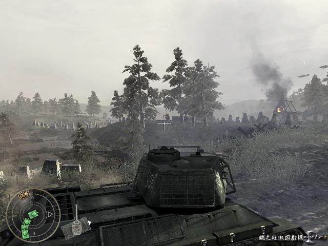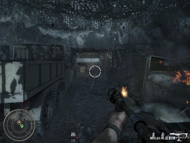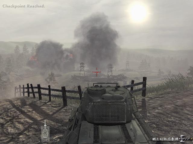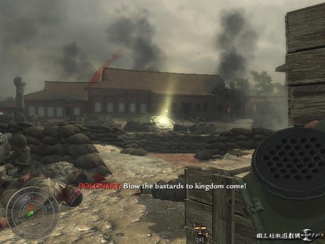 然後兩個小兵去開門時,第五輛戰車轟出來(可憐的小兵)幹掉後,可以在坦克衝出來的農場裡面找到一把MG42(現在的你是整個CoD5火力最強的時候),繼續跟著雷澤諾夫走,會進入德軍的陣地進行掃蕩戰,只要多注意塔上的步兵跟運兵車的出現就行了,掃蕩完畢後,mission 5 結束。