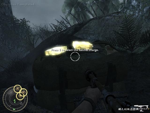 這時候會目標是炸毀三個機槍碉堡。每個碉堡附近都會有炸藥,不用跑回去拿,第一個目標請往右手邊走。