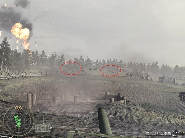 先是用機槍直接掃射原本就有的日軍,然後會開來兩台卡車,直接用機槍打爆卡車會比較快,然後一樣按六呼叫火力支援,瞄準的對象是那兩台日軍坦克。