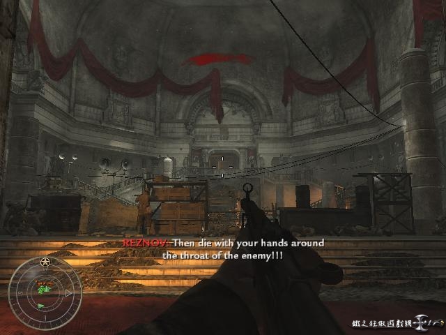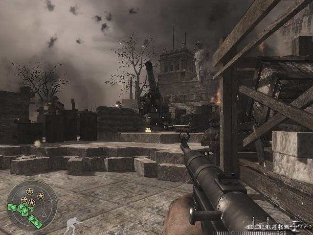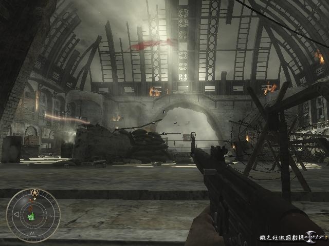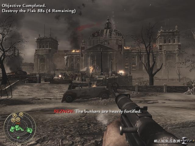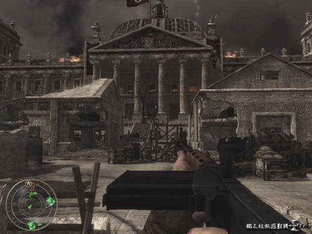 一開始往左邊走,前方的三層樓建築物裡面的德軍是無限再生的,請以最快的速度衝到左邊的入口,進入掃蕩。然後攻入前方的圖書館,一陣掃蕩後跳出圖書館。(跳出前可以到最右方盡頭去拿MG42)接著要攻入國會大廈啦。