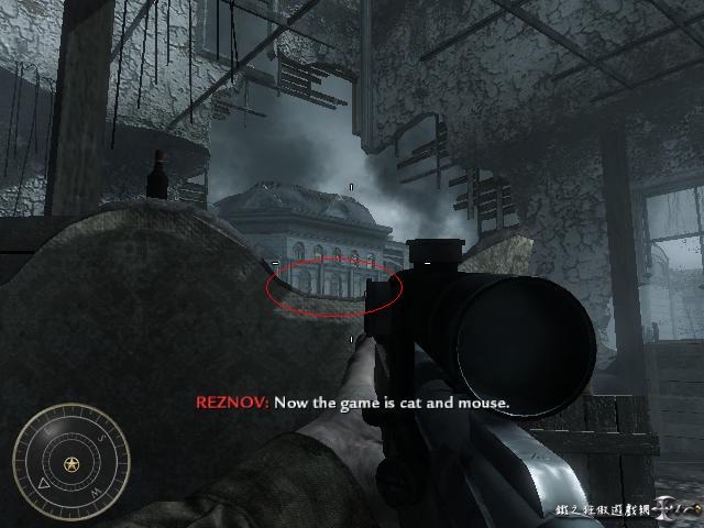 廢話省略。拿到槍後,還是要聽雷澤諾夫廢話一下等到你真的能開槍時,請別太衝動。外面的德軍都是兩兩一組,正面遠方是一人一犬,總共六個目標。請在飛機通過時開槍。打完後,跟著雷澤諾夫走進房子。(一路上廢話很多)到了二樓,捧上德軍的狙擊手攻擊,雷澤諾夫會當餌來引誘狙擊手,這時候請朝右邊窗口的那棟房子瞄準