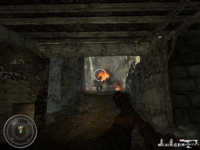 (這時可以再去傘包那邊把子彈補滿)下去後會先碰到一小群講話中的日軍,清到後往前方走。出了地道之後,要先攻打一個城樓。