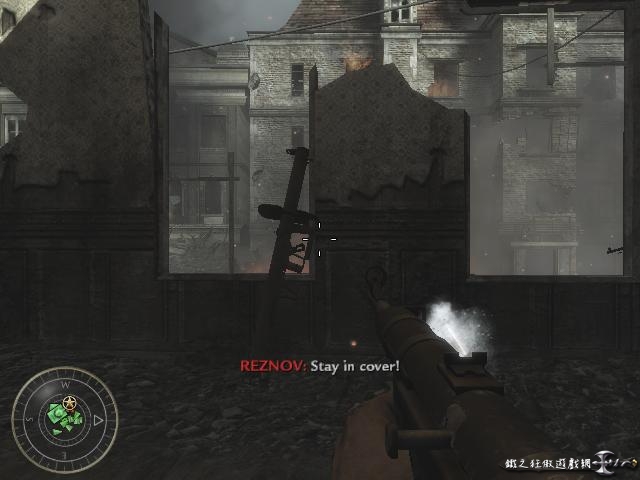 狙擊手會從左邊往右邊跑,請抓跑的時機開槍。打死狙擊手後,兩人下樓。沒想到碰到德軍巡邏隊。被發現後,德軍會往屋子內噴火,請趴下跟著雷澤諾夫走,爬到盡頭會有兩人向屋內開火,可殺可不殺。轉身走一段,上樓梯前又有人開火,建議殺掉。爬樓梯爬沒兩步,被倒下來的木頭壓住,會看見雷澤諾夫英勇的幫你搬開木頭啊(注意他的手,都是血),往上走後,到一個窗口要你往下跳。跳下後被三個德軍發現,正當雷澤諾夫要被燒成炭烤時,友軍趕到。接著跟著爬上樓梯,先是往左邊預備狙擊下方的德軍,這時候請優先殺火焰兵(誰叫你剛剛想燒我)第一場支援結束後繼續往前走(左方會有一把反物質步槍,可拿可不拿)然後是第二次的支援戰,左方樓頂有士兵,正前方大樓有機槍手,下方是滿滿的士兵跟兩台裝甲車會跑出來。可以慢慢狙殺,也可以先幹掉前方屋內的德軍,用機槍來火力支援。