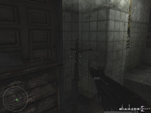 德軍可以分成前方木板掩體跟後方樓梯兩道防線,從左方或是右方突破第一道掩體後,可以看見剩下的德軍往樓梯撤退。緊接著是先上樓,上樓前可以看見一把RTRS41,請一定要拿,因為接下來要做的是從二樓支援下方進攻後廳的我方人員,
