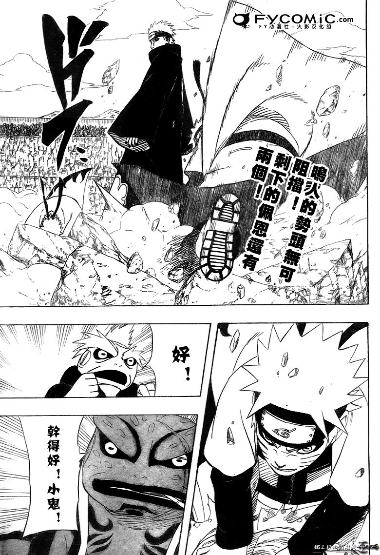 與佩恩面對面一決雌雄。在仙人‧鳴人的狀態下,打倒了4個佩恩,剩下最後一個佩恩時