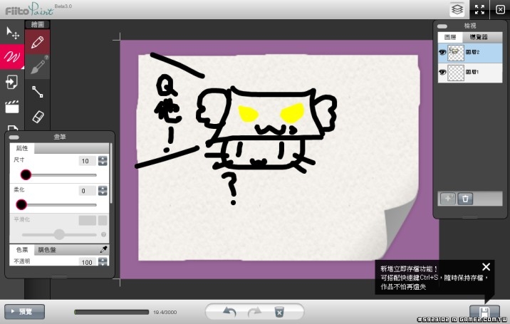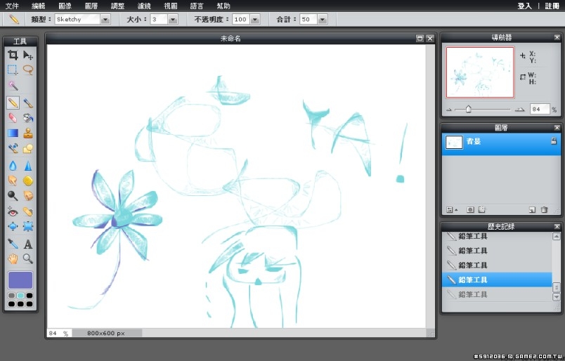 大概玩了一下,不知道是不是用IE的緣故,許多的快捷鑑會與IE視窗衝突。線條方面比較微妙,好像沒辦法直接畫出較平穩的線,另外圖層要畫陰影的話,只能使用遮色片。