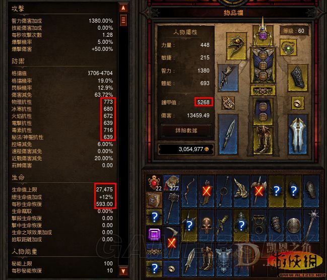 這是我打通A3A4的原始屬性圖,為什麼前面說我受到傷害是0.042?我們先假設近戰的那一下傷害是物理的,我滿buff後物抗=773*(1+0.4)=1082,護甲=5268*(1+0.65+0.15)=9482,那麼我受到的近戰物理傷害=(1-1082/1382)(1-9482/12482)(1-0.2)=0.0417,大約0.042。所以大家看到了,我的防禦屬性真心是已經很好了啊,但是100k傷害的怪物摸我一下還是得掉4500
