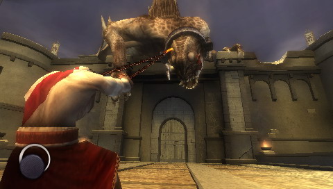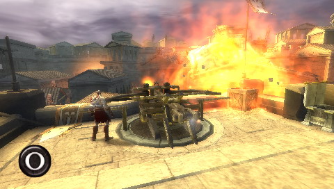 走出外面,清除一些瑣碎的建築來補充紅魂,走到一輛攻城車面前按圈和搖桿來操控車子的前進與後退(地面上出現紅色光環便是轟炸的落點,注意閃躲,很痛!)將車子推到大門攻破城門!