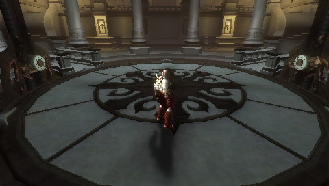 下樓梯,至此平台!打碎左右兩邊的扣環使得平台下降!平台下降過程中會陸續出現敵人!降到底部類比競技場,出現一個持盾敵人,很輕鬆,方塊方塊圓圈破盾!之後出現QTE結束他的戰神雜兵生涯!對面三個紅魂箱子以及一個紅藍雙補箱子!舒服!