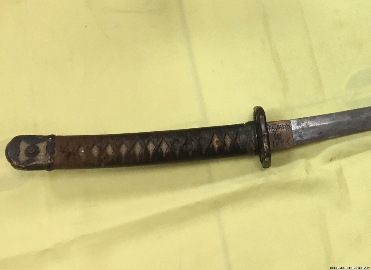 武士刀刀炳銅片處刻寫著「南京の役 殺一0七人」字樣。(中央社)