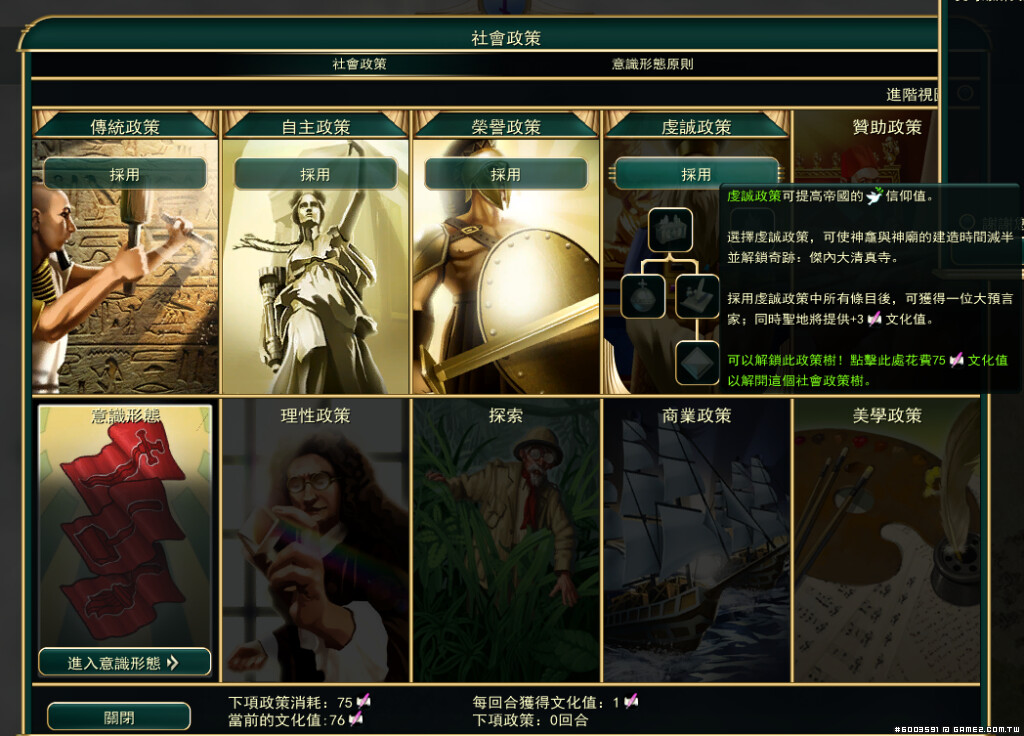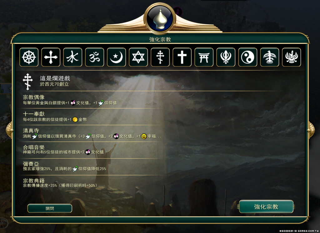 在文明帝國除了社會政策能強化國家之外,還有一個更強大的文化加成,那就是宗教,要搶宗教和傳教都很麻煩也很難,但有搶到的話不如玩玩看,同時也是邁向文化勝利的要點之一。