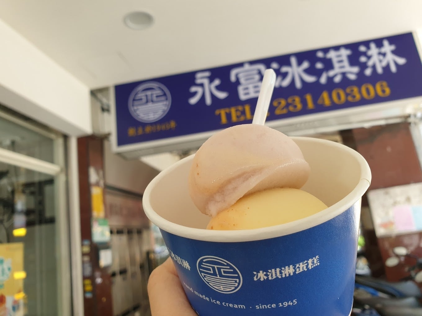 「永富冰淇淋」創立於 1945 年,老闆親自向日本人學習製冰的技術,從小攤車做到大店面,販賣的冰淇淋就是很古早的那種「叭噗」冰,招牌三色冰分別是芋頭、雞蛋、紅豆,還有李梅、桂圓都很必點,冰淇淋吃起來很綿密,每個口味都各有特色,吃一口就能讓人瞬間回到過去!